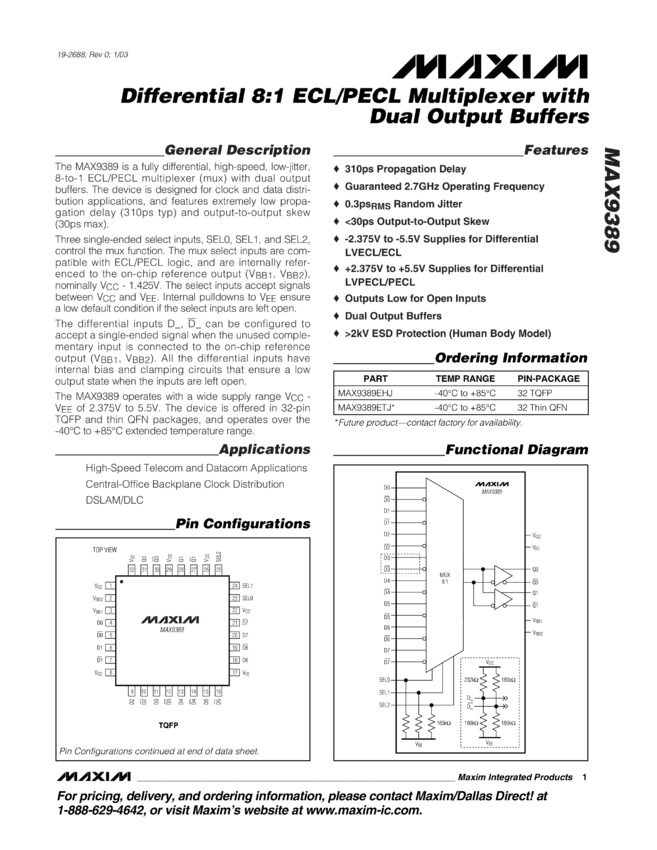 MAX9389 Differential 8:1 ECL/PECL Multiplexer with Dual Output Buffers