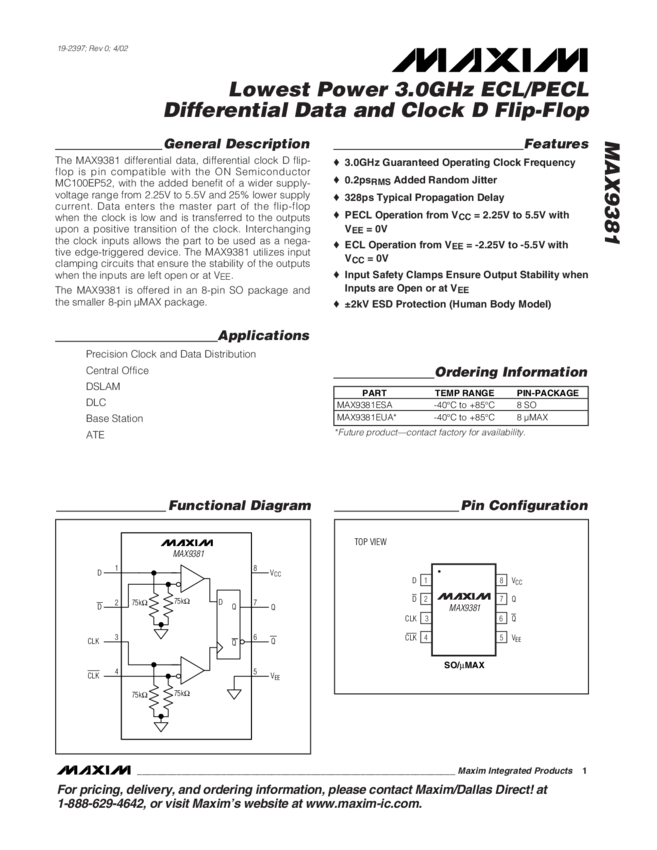 MAX9381 3.0GHz ECL/PECL Differential Data and Clock D Flip-Flop