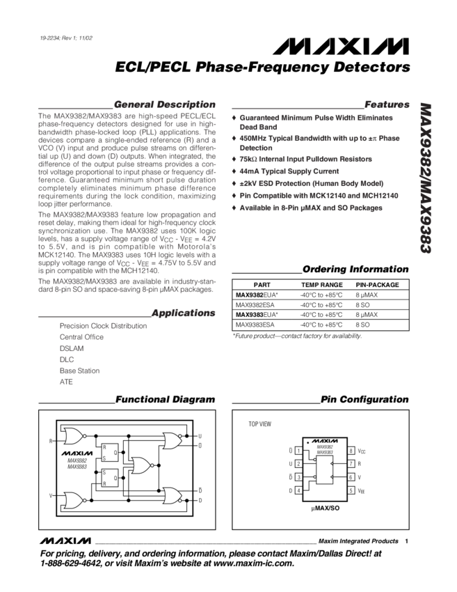 MAX9382 ECL/PECL Phase-Frequency Detectors