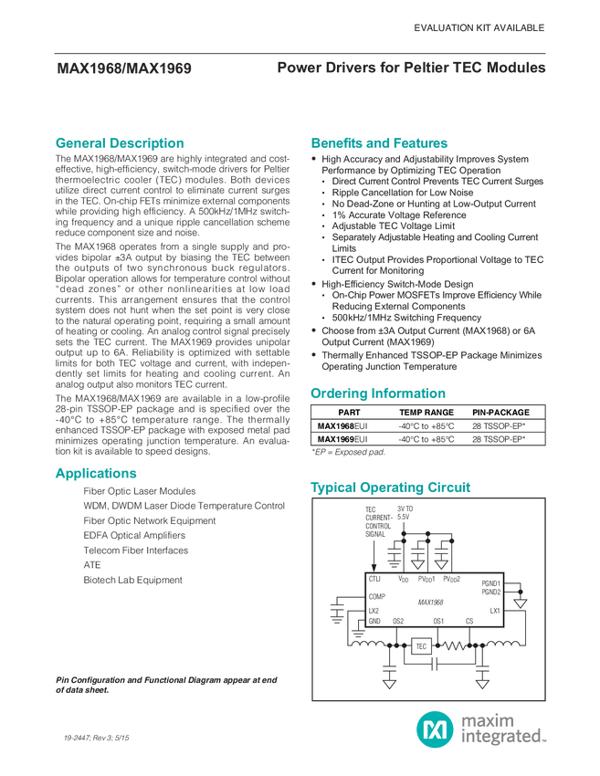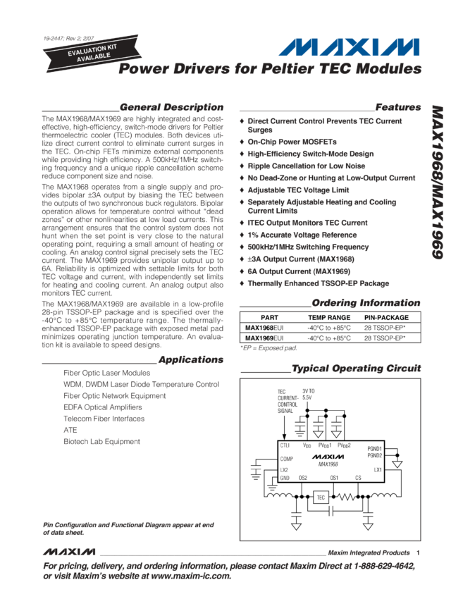 MAX1968, MAX1969 Power Drivers for Peltier TEC Modules