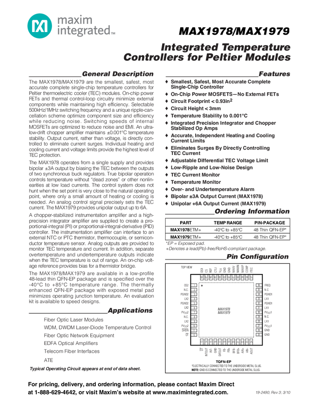 MAX1978, MAX1979 Integrated Temperature Controllers for Peltier Modules