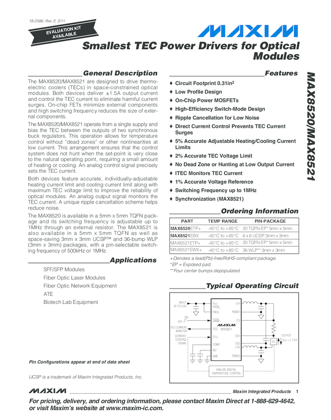 MAX8521 Switch-mode +/-1.5A Current Controlled Power Driver for Peltier TEC Modules