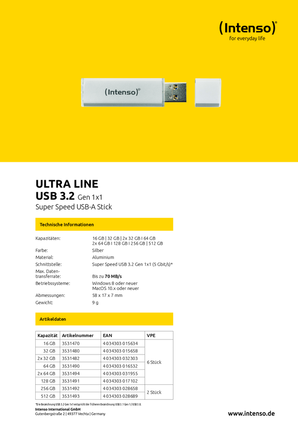 Intenso Ultra Line Pendrive USB 32 GB srebrny 3531482 USB 3.2 Gen 1
