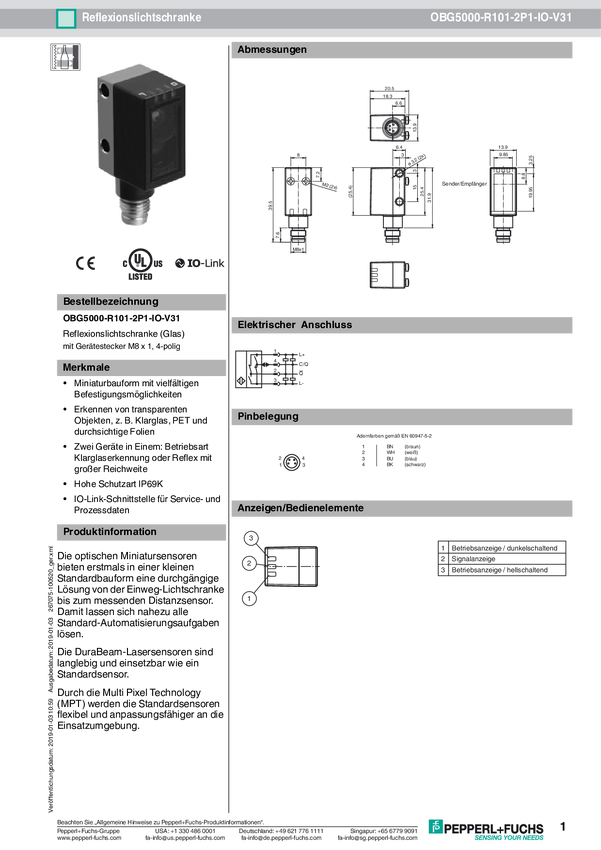 Fotokomórka odbiciowa Pepperl+Fuchs OBG5000-R101-2P1-IO-V31 267075-100520 Przełącznik (Jasność / Ciemność) 1 szt.