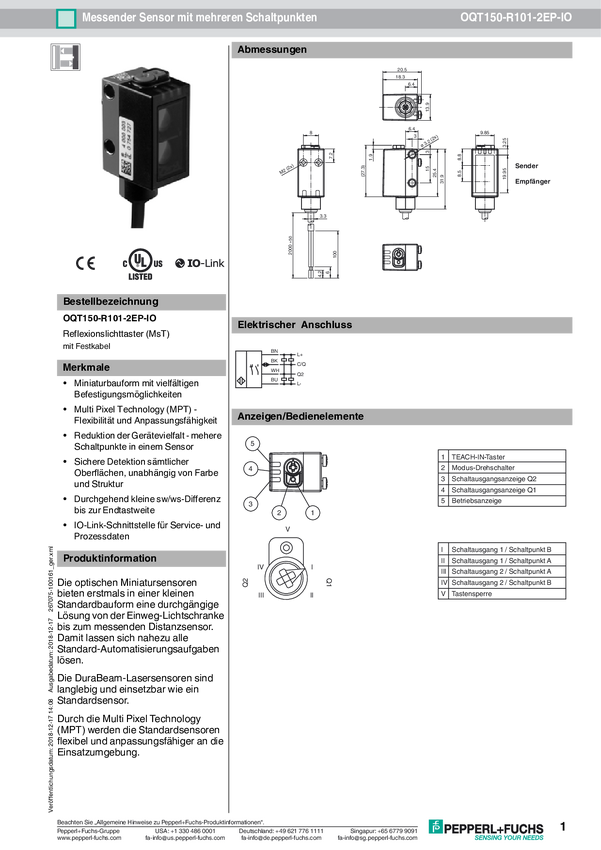 Czujnik dyfuzyjny Pepperl+Fuchs OQT150-R101-2EP-IO 267075-100161 Teach-In 1 szt.