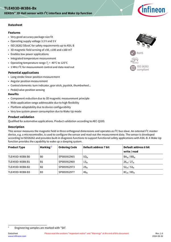 XENSIV™ - TLE493D-W3B6 B3 perfect suit for automotive, consumer and industrial applications XENSIV™ TLE493D-W3B6 is a magnetic 3D Hall sensor from Infineon’s latest generation. Part of the TLE493D-x3xx family, it offers a wider supply voltage range, full ISO 26262 compliance, and improved drift values. TLE493D-W3B6 B3 is preconfigured with a specific I2C address to enable operation in bus mode. This capability enables up to 4 sensors to share the same bus. All features and target applications are identical