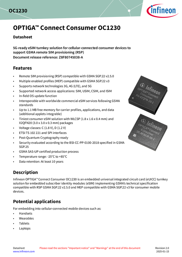World’s tiniest GSMA-compliant and world’s first 28 nm eSIM solution optimized for mobile consumer devices OPTIGA™ Connect Consumer OC1230 comes with a rich feature set optimized for mobile consumer devices, making it the perfect fit for even the tiniest mobile consumer devices like smart watches and other wearables. The security architecture is based on the Arm® v8 and Infineon’s Integrity Guard 32 technology for increased performance and less power consumption. RSP and MEP compliant with GSMA SGP.22 v3 g
