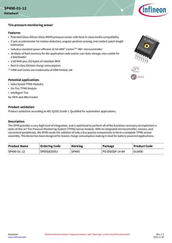 XENSIV™ - SP490-01-12 high level of integration tire pressure monitoring sensor ensures industry leading performance TPMS Optimized for battery-powered apps, SP49 with flexible wake-up, power management, ultra-low power down current. Wide range of supply voltage ensures a long-lasting battery lifetime (typ. TPMS apps 10 yrs with a CR2032 battery). Generating a wake-up from the integrated interval timer, SP49 is perfect for standalone remote pressure sensing demanding low charge consumption. Wake-up capabil