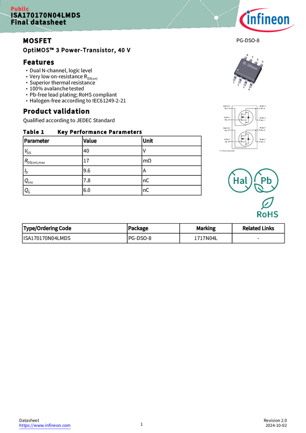OptiMOS™ Dual N+N channel power MOSFET 40 V in SO-8 package With the new OptiMOS™ Dual power MOSFET 40 V (ISA170170N04LMDS) in SO-8 package, Infineon offers a benchmark solution for best price performance products.The N+N dual channel MOSFETs are a perfect solution for applications such as lawn mower robots, vaccum robots, drones and many other low power DCDC applications. Moreover, the Dual MOSFETs are an excellent choice for creating compact and straightforward design solutions.