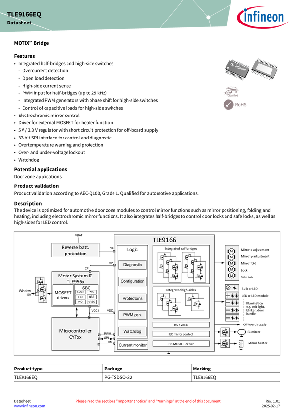 MOTIX™ TLE9166EQ: a powerful, versatile multi half-bridge IC for door control modules and zone controllers, offering top performance and flexibility. MOTIX™ TLE9166EQ multi half-bridge IC is perfectly suited for door lock, safe lock, mirror fold and adjustment functionalities, offering precise and accurate motor control for optimized performance. MOTIX™ TLE9166EQ offers a compact solution with small package and inrush current (IC) management for DC motors, incandescent bulbs and LEDs, ensuring seamless int