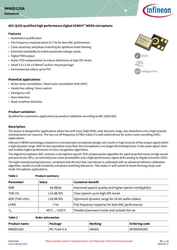 XENSIV™ IM66D120A high performance digital MEMS microphone: best fit for automotive applications in particular Active Noise Cancellation High-performance digital MEMS microphones qualified according to automotive quality standard AEC-Q103-003. They are suited to all applications inside and outside the car, where the best audio performance in harsh environments and a digital PDM interface is required. They also perfectly support acoustic noise cancellation applications with its flat and stable frequency and