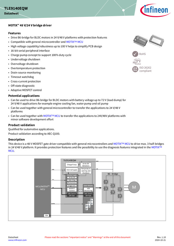 MOTIX™ TLE9140EQW is a gate driver for BLDC motor drives designed for a broad range of applications with supply voltage ranging from 8V~72V MOTIX™ TLE9140EQW gate driver IC is designed for 24/48V BLDC motors applications with a supply voltage range from 8 V to 72 V. The device has innovative features integrated such as an active gate shaping feature that can improve EMC perfomance and reduce power dissipation. The product is designed in a small TS-DSO-32 packge which reduces overal PCB space of designs and