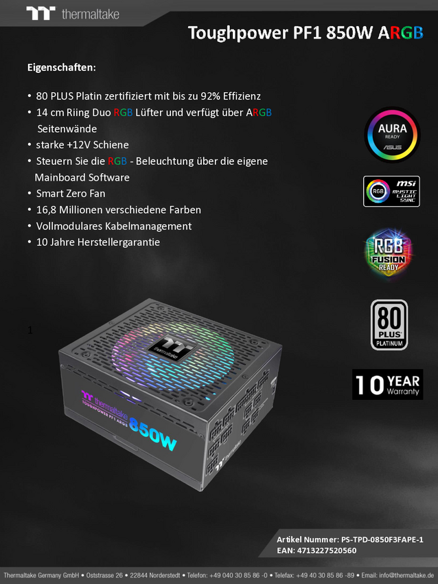 Thermaltake Toughpower PF1 ARGB Zasilacz do komputera 850 W ATX 80 PLUS® Platinum
