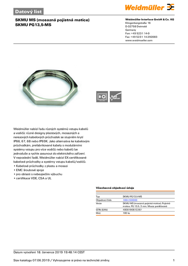 Weidmüller 1694100000 Nakrętka kontrująca SKMU PG13,5-MS, PG13.5, 100 szt.