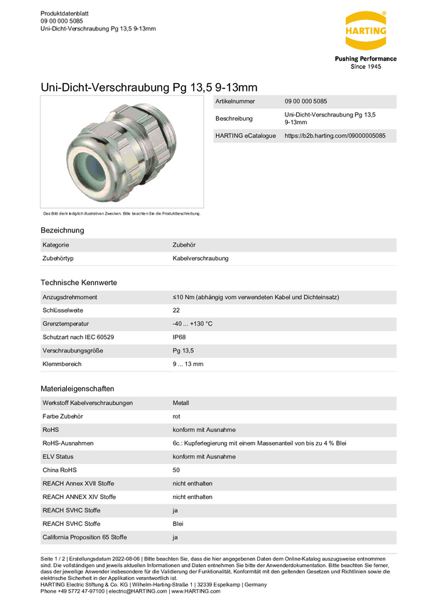 Harting 09000005085 Dławnica kablowa PG13.5 metal czerwony 1 szt.