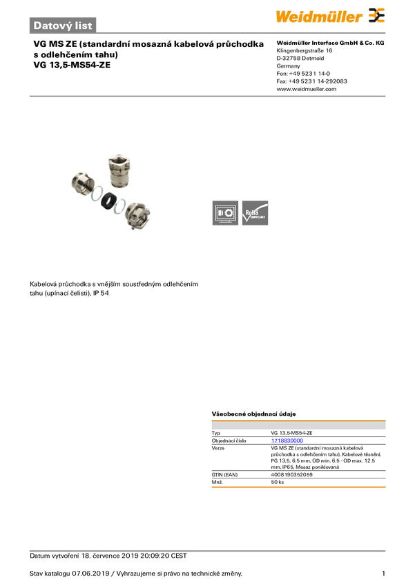 Weidmüller 1569090000 Dławnica kablowa VG 13,5-MS68, od 6 mm, do 12 mm, PG13.5, 50 szt.
