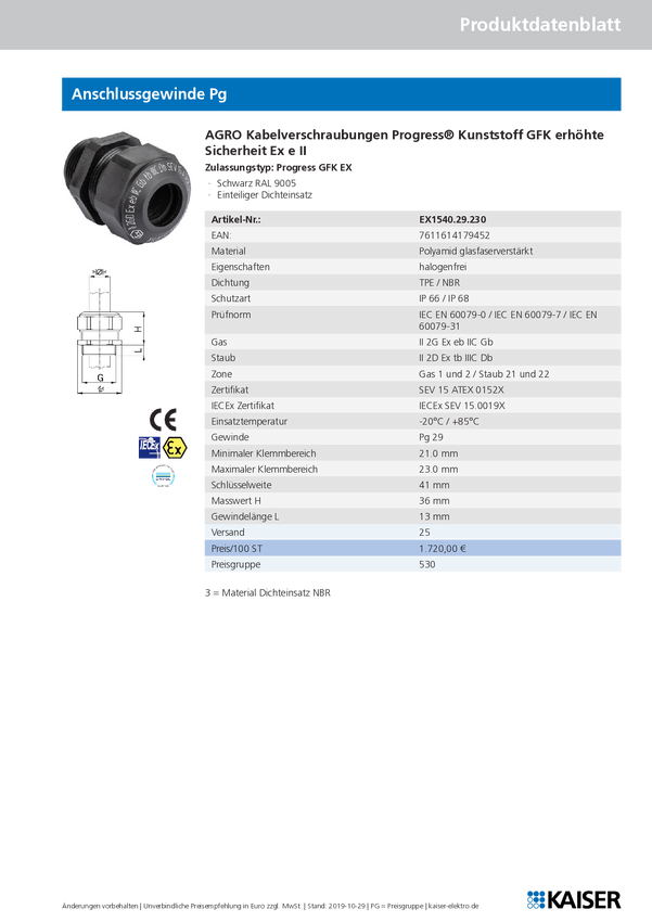 Kaiser Elektro EX1571.29.210 Dławnica kablowa Kaiser, od 19.50 mm, do 21 mm, PG29, 1 szt.
