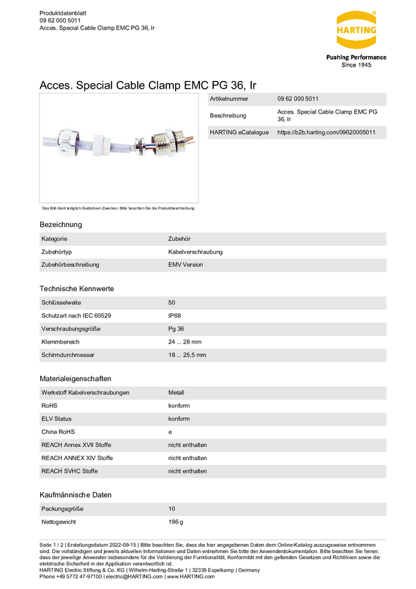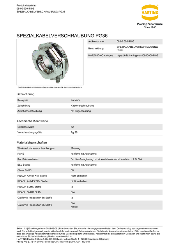 Harting 09000005196 Dławnica kablowa 09 00 000 5196, PG36, 1 szt.