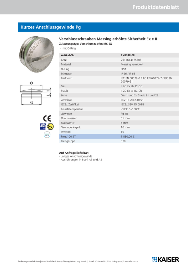 Kaiser Elektro EX8748.08 Zaślepka PG48 metal 1 szt.