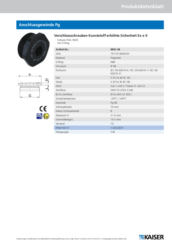 Kaiser Elektro 8841.48 Zaślepka, PG48, 1 szt.