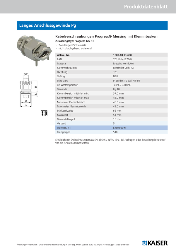 Kaiser Elektro 1800.48.13.490 Dławnica kablowa PG48 metal 1 szt.