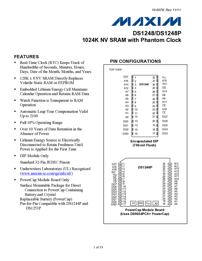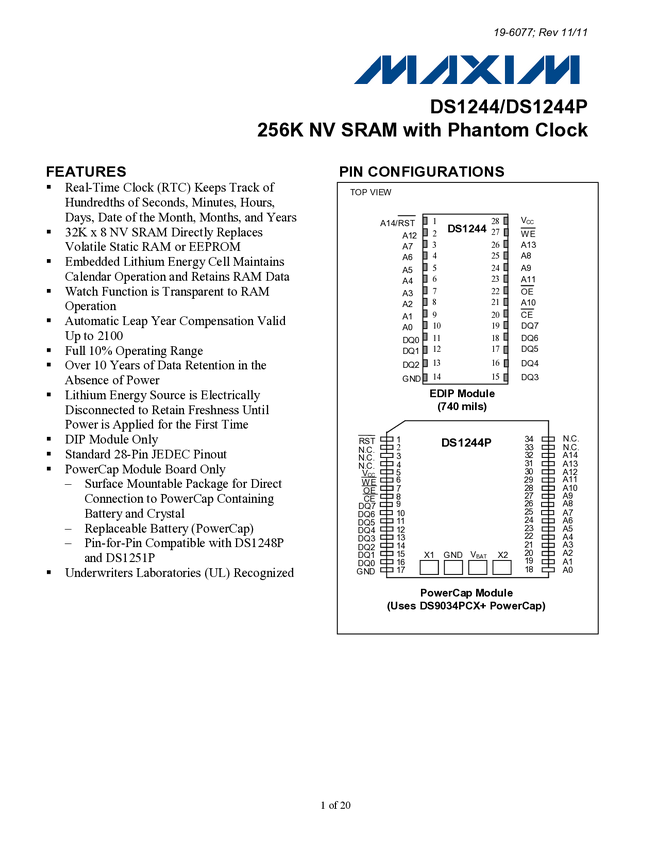 8KX8 NV SRAM WITH PHANTOM CLOCK 28 EDIP PIN for Pin comaptible with other densitys of. DS164.. Propujemy zamiennik DS1644-120+ lub podobny M48z18..
