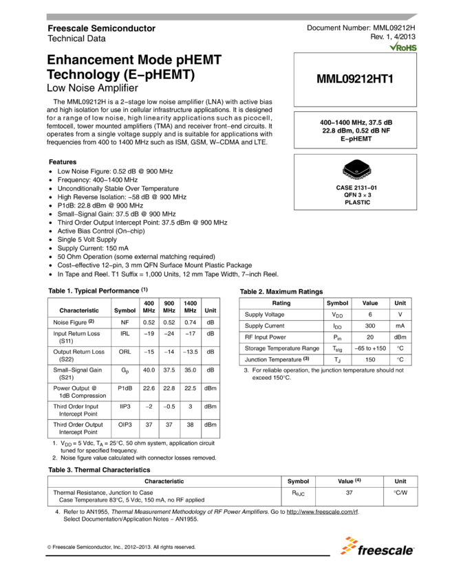MML09212HT1 400-1400 MHz, 37.5 dB, 22.8 dBm, 0.52 dB NF E-pHEMT