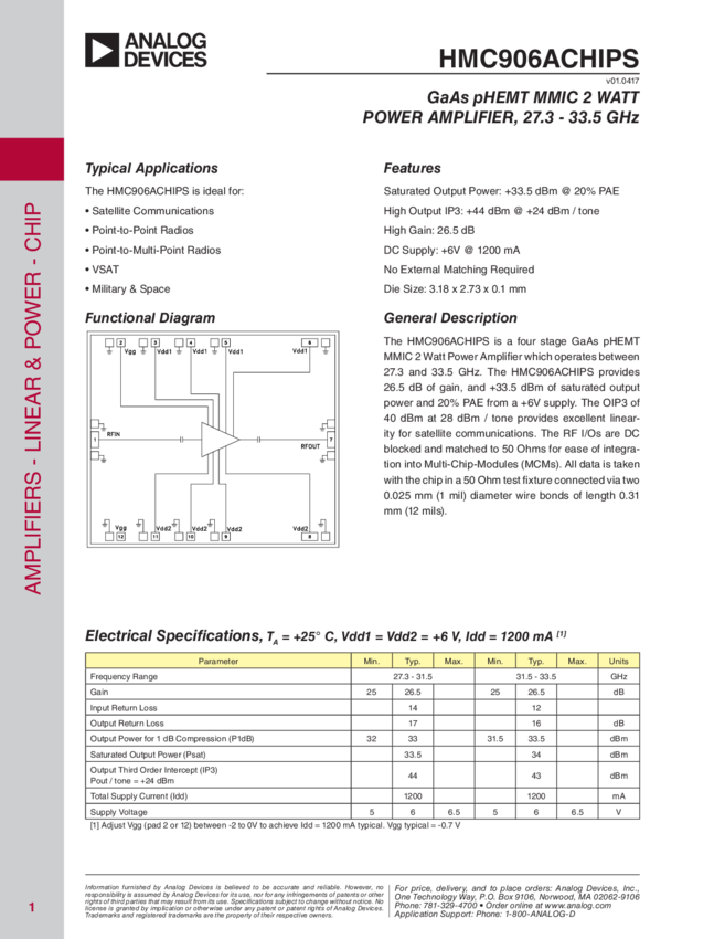 GaAs pHEMT MMIC 2 Watt Power Amplifier, 27.3 - 33.5 GHz