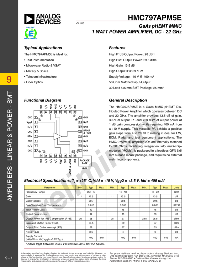 GaAs pHEMT MMIC 1 Watt Power Amplifier, DC - 22 GHz