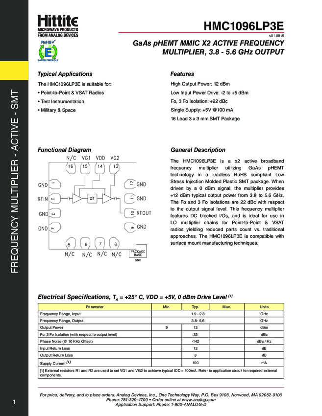 GaAs pHEMT MMIC x2 Active Frequency Multiplier, 3.8-5.6 GHz Output