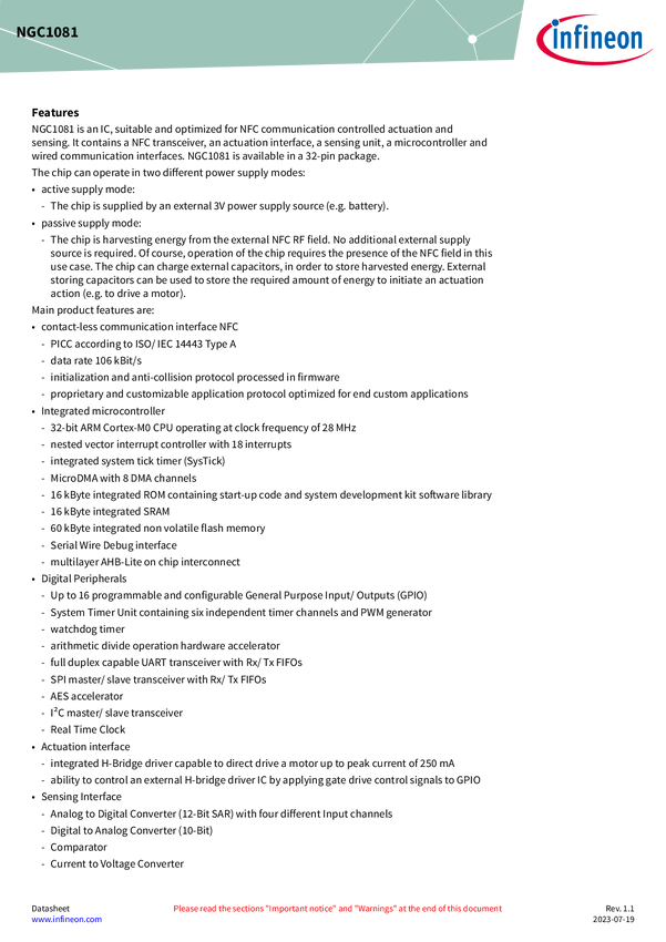 NFC tag-side controller for smart sensing applications The NGC1081 is a microcontroller with integrated NFC connectivity, sensing capabilities, and energy harvesting functions. It allows for the development of miniaturized smart devices that can be controlled and powered by a personal mobile phone. It can operate in passive mode, where it communicates wirelessly and harvests energy from the NFC field as well as in battery mode as a self-contained sensing node.
