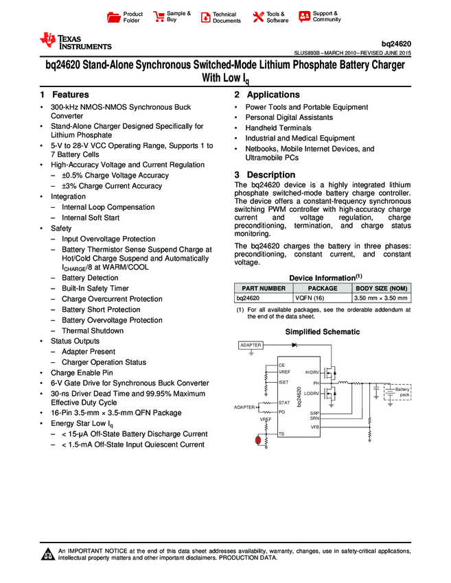 Battery Charger Controller Lithium Phosphate 16-Pin VQFN EP T/R