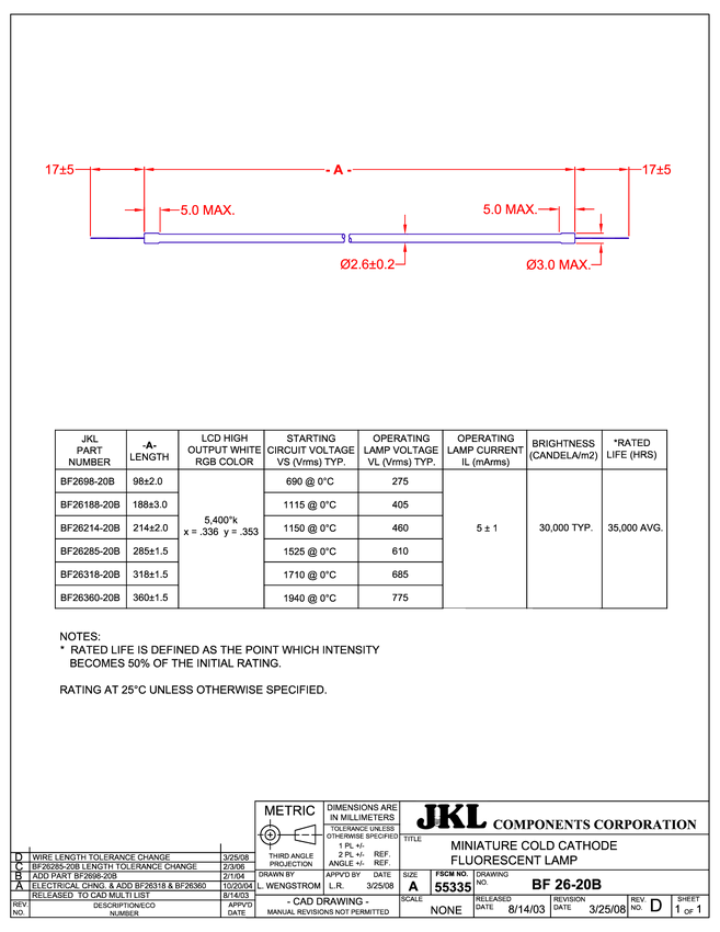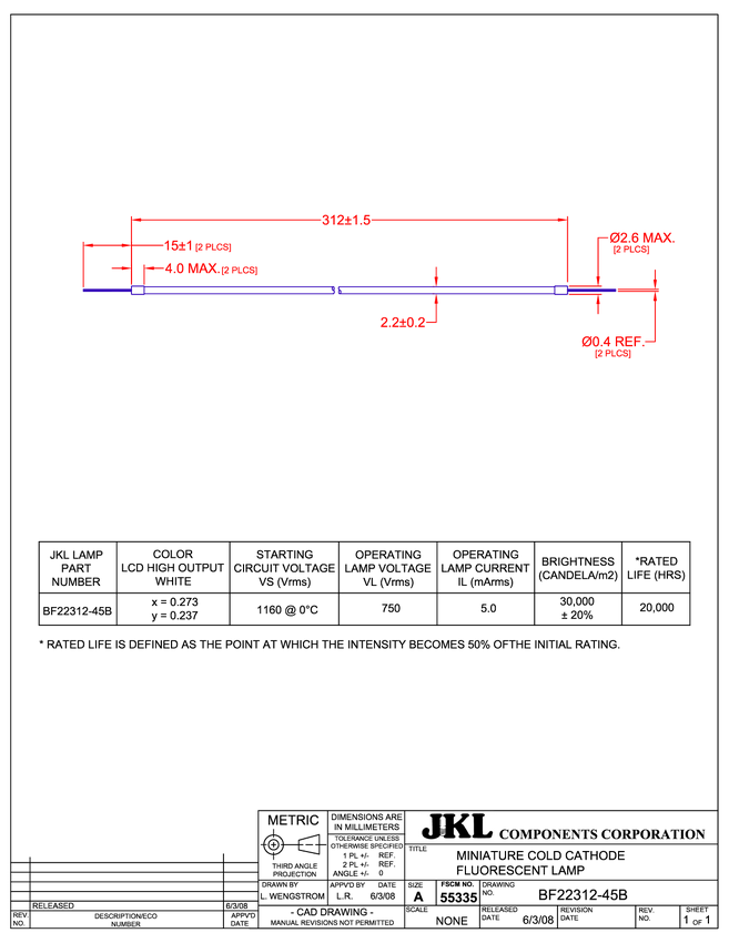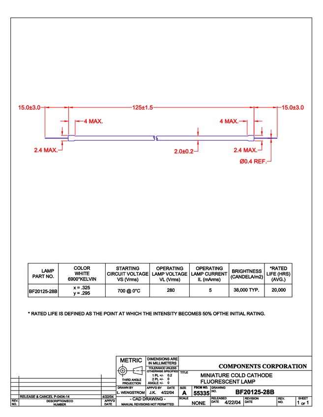 Lampa CCFL średnica 2,0 mm długość 125 mm 700V start 280 V operating 5 mA tri Phosphor RGB White lamp Temperatura barwowa 5100 K - 5716 K