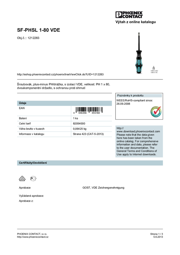 Wkrętak plus/minus Phoenix Contact SF-PHSL 1-80 VDE 1212283 10 szt.
