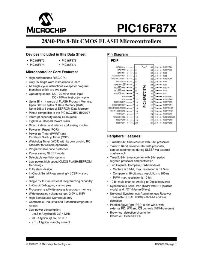 Procesor PIC PIC16F873-20/SP SDIP-28 Microchip Technology