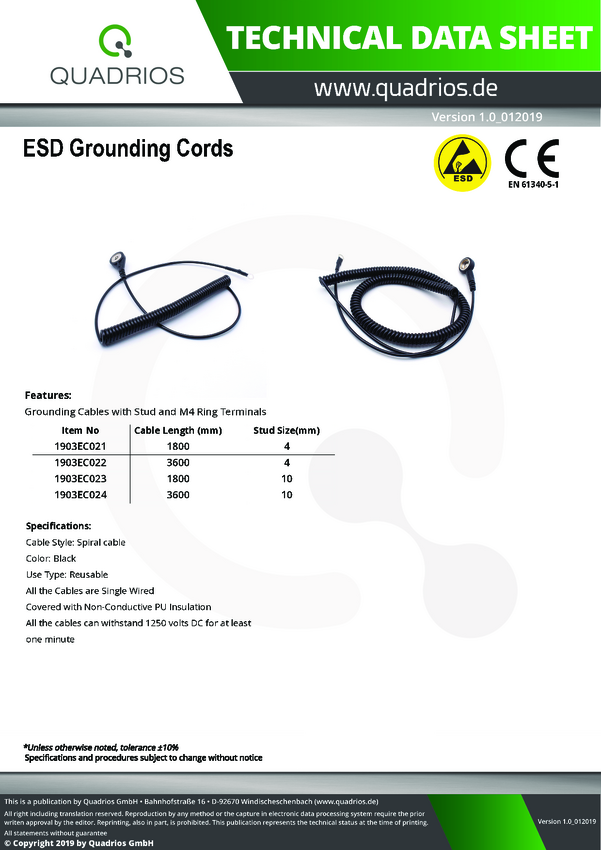 Quadrios Przewód uziemiający ESD 1.80 m przycisk 4 mm, złącze kablowe pierścieniowe
