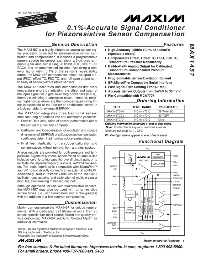 MAX1450 Low-Cost, 1%-Accurate Signal Conditioner for Piezoresistive Sensors