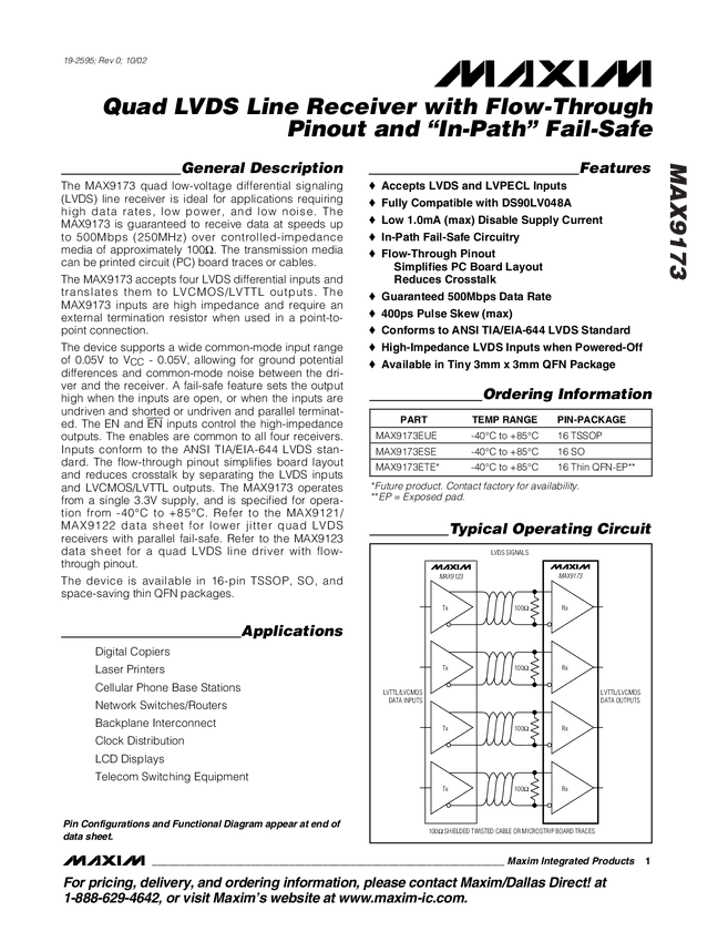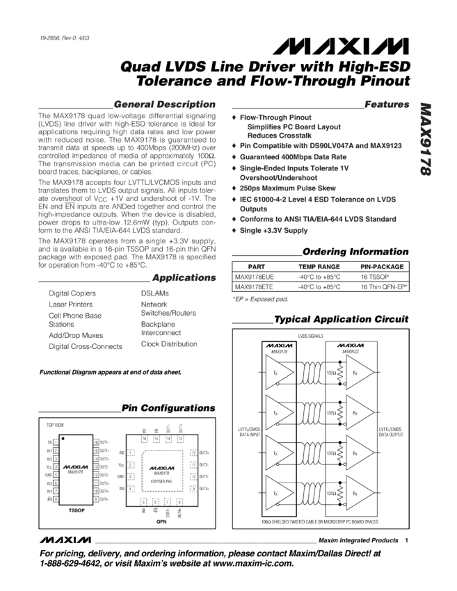 MAX9178 Quad LVDS Line Driver with High-ESD Tolerance and Flow-Through Pinout