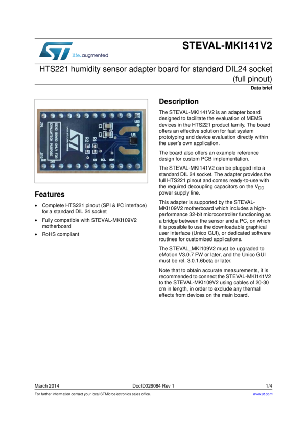 HTS221 humidity sensor adapter board for standard DIL24 socket (full pinout)