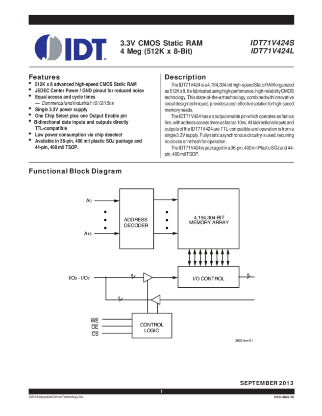 3.3V 512K x 8 Asynchronous Static RAM Center Pwr & Gnd Pinout