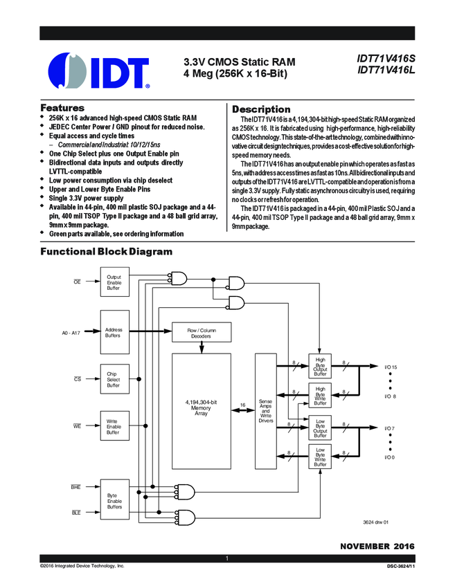 3.3V 256K x 16 Asynchronous Static RAM Center Pwr & Gnd Pinout