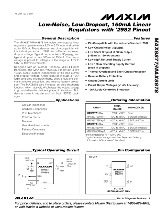MAX8878 Low-Noise, Low-Dropout, 150 mA Linear Regulator with '2982 Pinout and Auto-Discharge