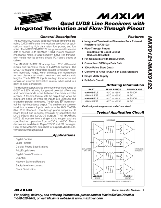 MAX9122 Quad LVDS Line Receivers with Integrated Termination and Flow-Through Pinout