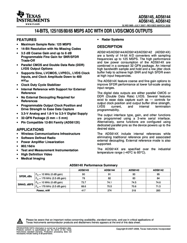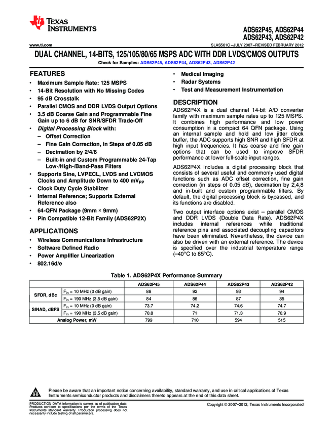 ADC Quad Pipelined 105Msps 14-bit Serial (1-Wire, 2-Wire)/LVDS 64-Pin VQFN EP T/R
