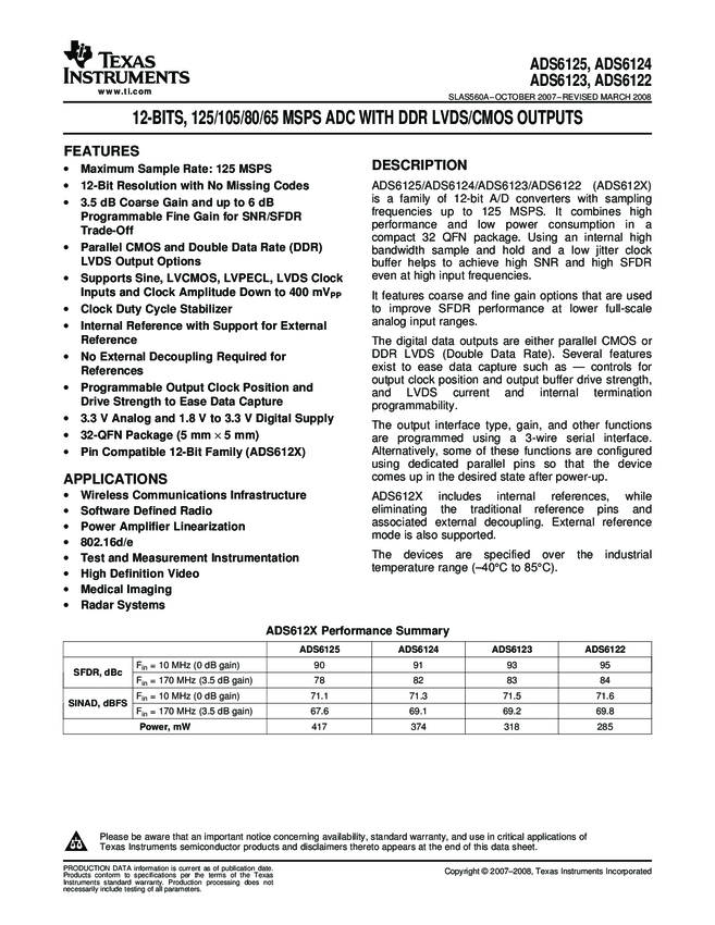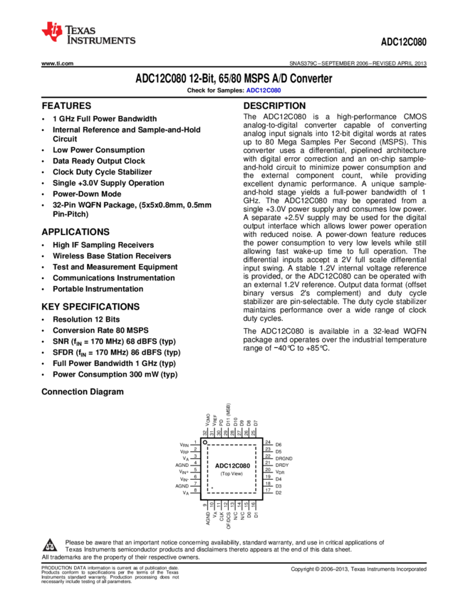 ADC Single Pipelined 80Msps 12-bit Parallel 32-Pin LLP EP