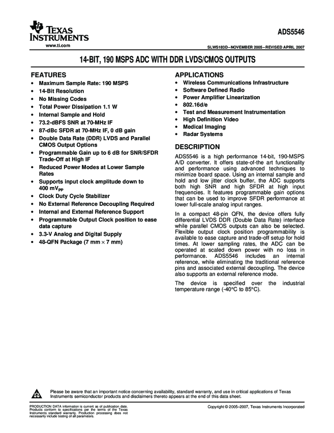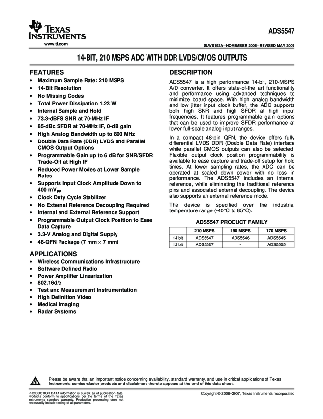 ADC Single Pipelined 190Msps 14-bit Parallel/Serial/LVDS 48-Pin VQFN EP T/R