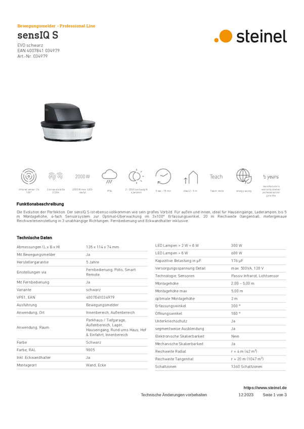 Czujnik ruchu PIR Steinel 034979 300 ° IP54 czarny