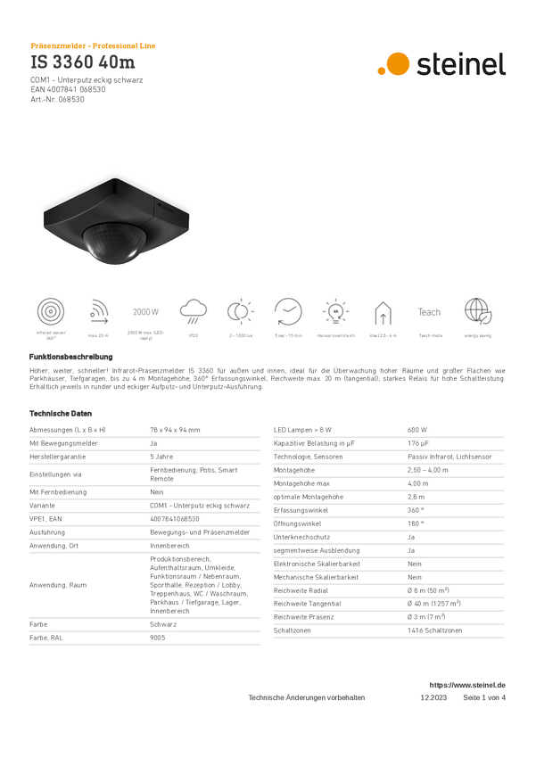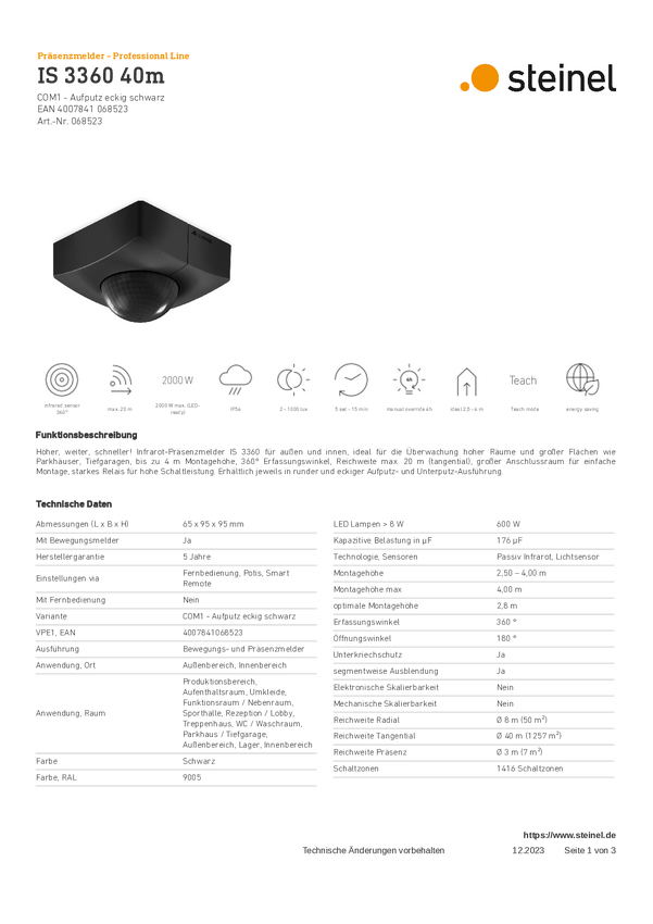 Czujnik ruchu PIR Steinel 068523 360 ° IP54 czarny