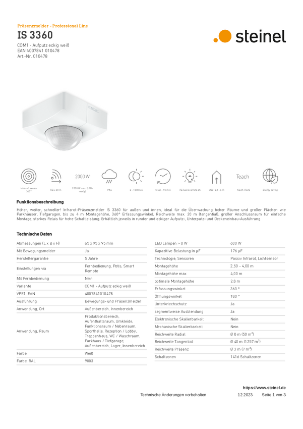 Czujnik ruchu PIR Steinel 010478 360 ° IP54 biały