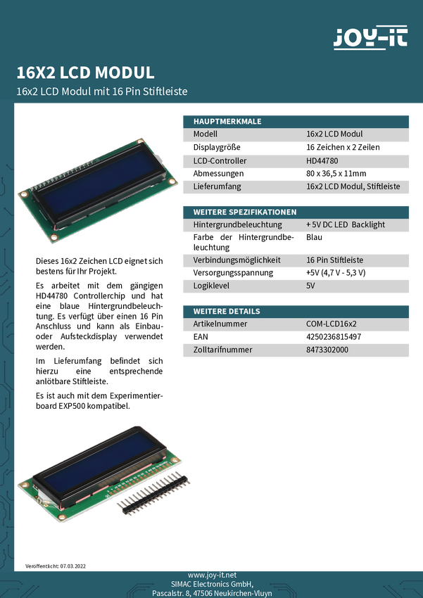 Moduł wyświetlacza Joy-it com-lcd 16x2 6.6 cm (2.6 cal) 16 x 4 Pixel Pasuje do: Arduino